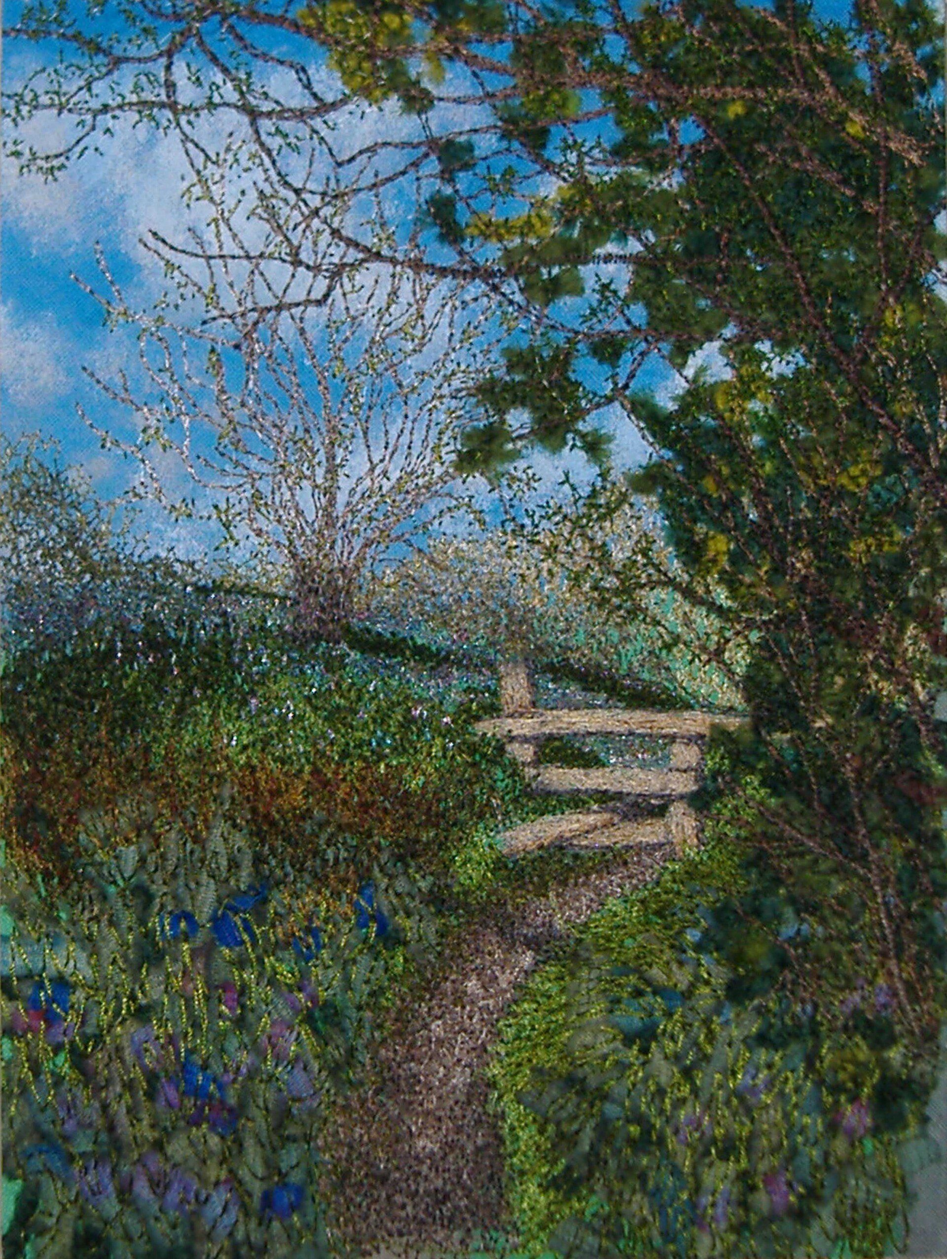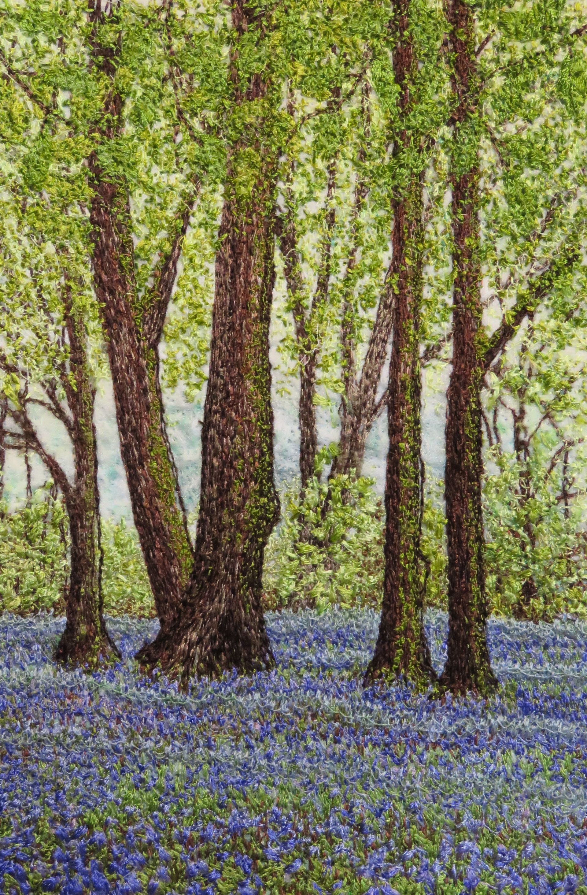 ButtonThis embroidery is a mixture of imaginary and realistic landscape. The leaves and bluebells are created with loose tension bobbin embroidery.