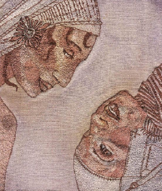 ButtonFree Machine embroidery on silk roving appliqed to calico. Lady B is one of the first faces stitched by Claire
