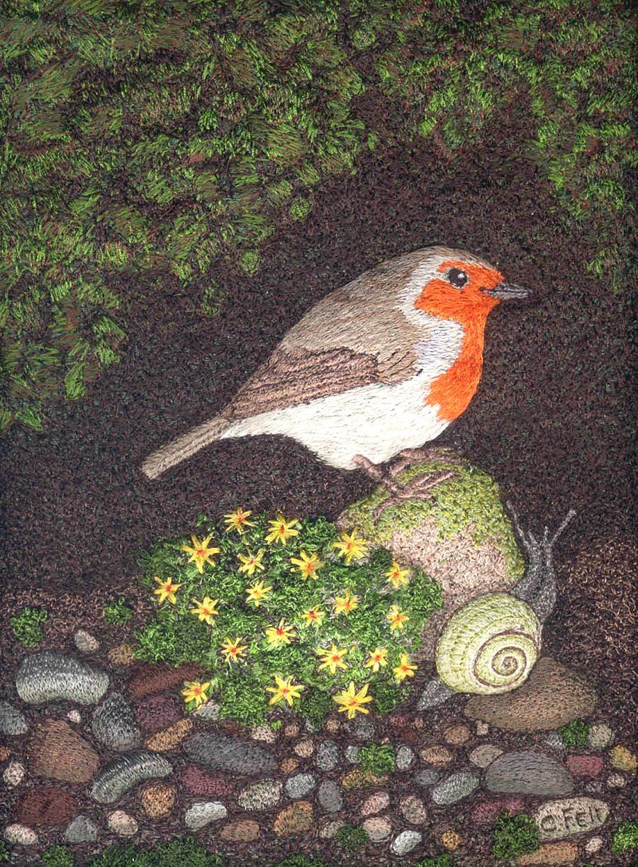 ButtonThis robin is part of a project in my book. After completion claire felt the background was dull so she handpainted into the embroidery and background fabric.